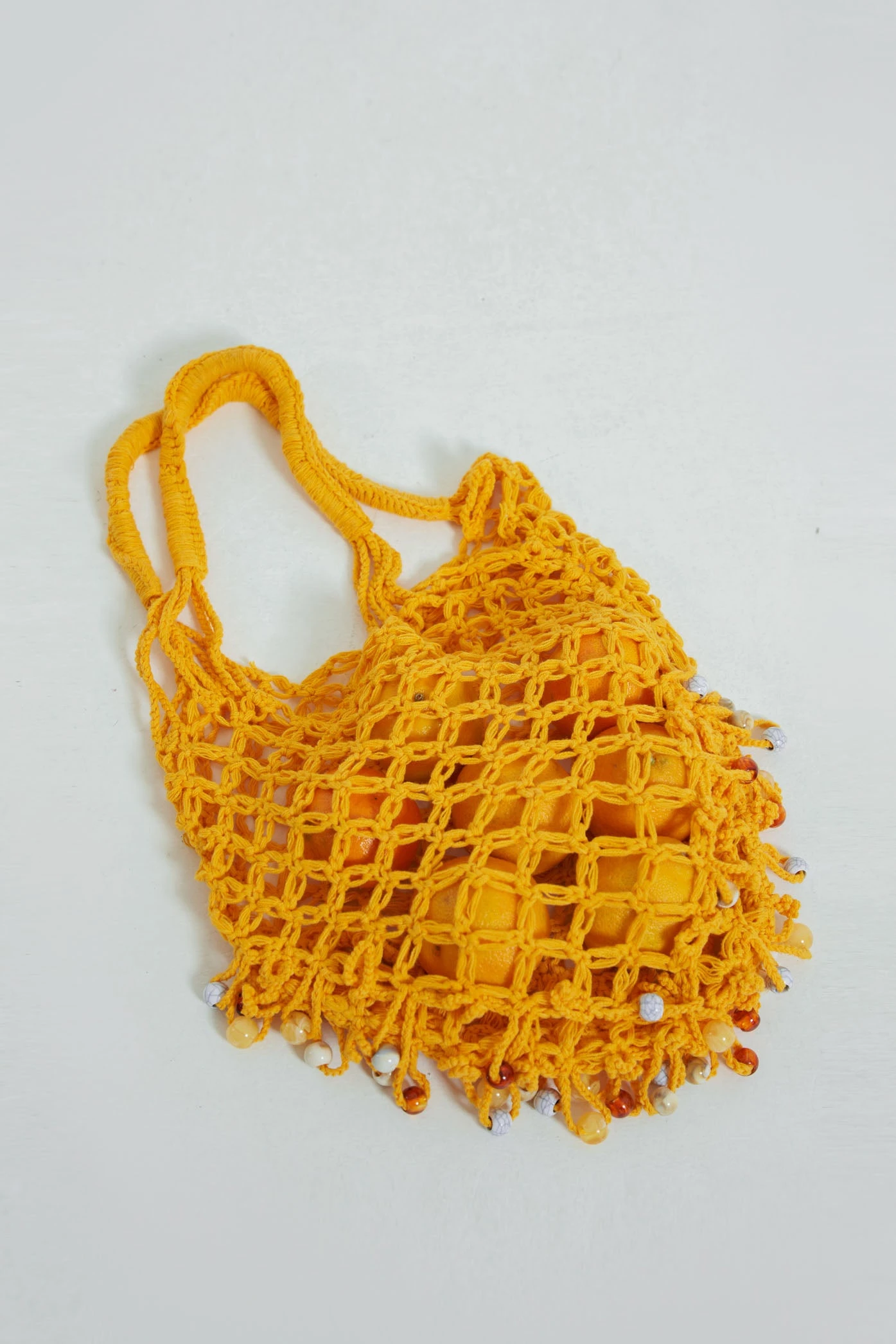 Envelop your beach essentials in luxury with the Canary Knit Bag. This decorative macrame bag features a combination of yellow crochet fabric and intricate beaded fringe detail, with double square knot handles for a secure carry. Make a statement with the matching bikini and shorts for the perfect poolside look.