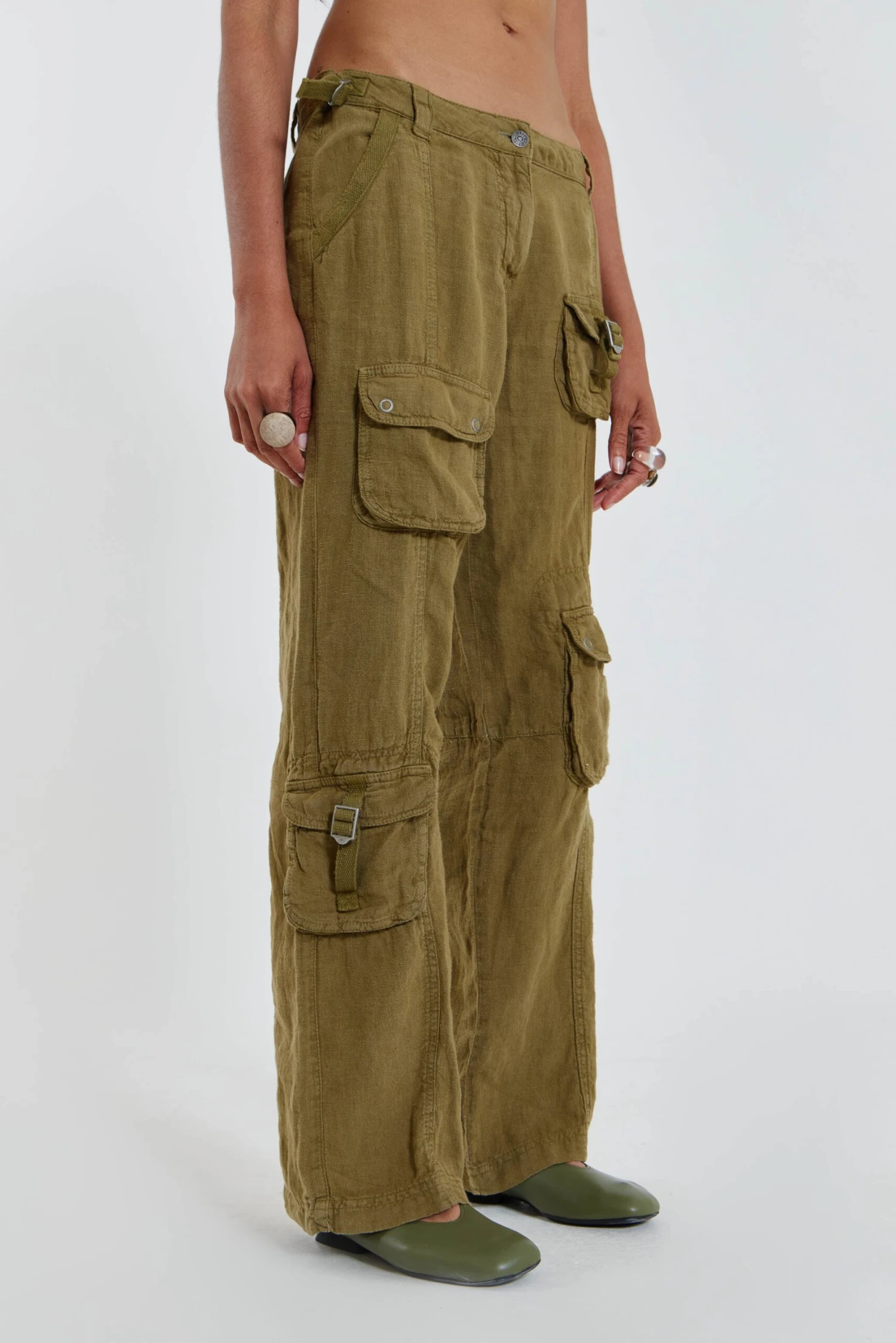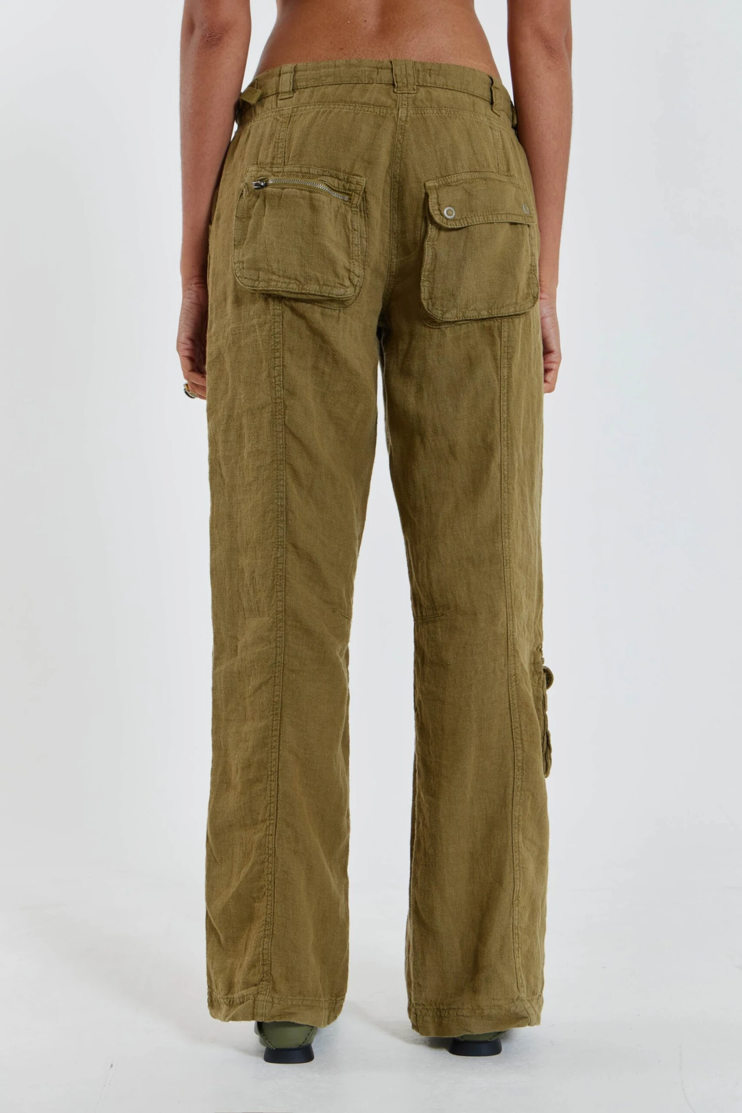 Introducing the Devon Cargo Trousers “ crafted from a khaki linen fabric, these skinny fit trousers feature antique silver hardware and functional cargo pockets. Complete the ensemble with the matching cargo shirt.