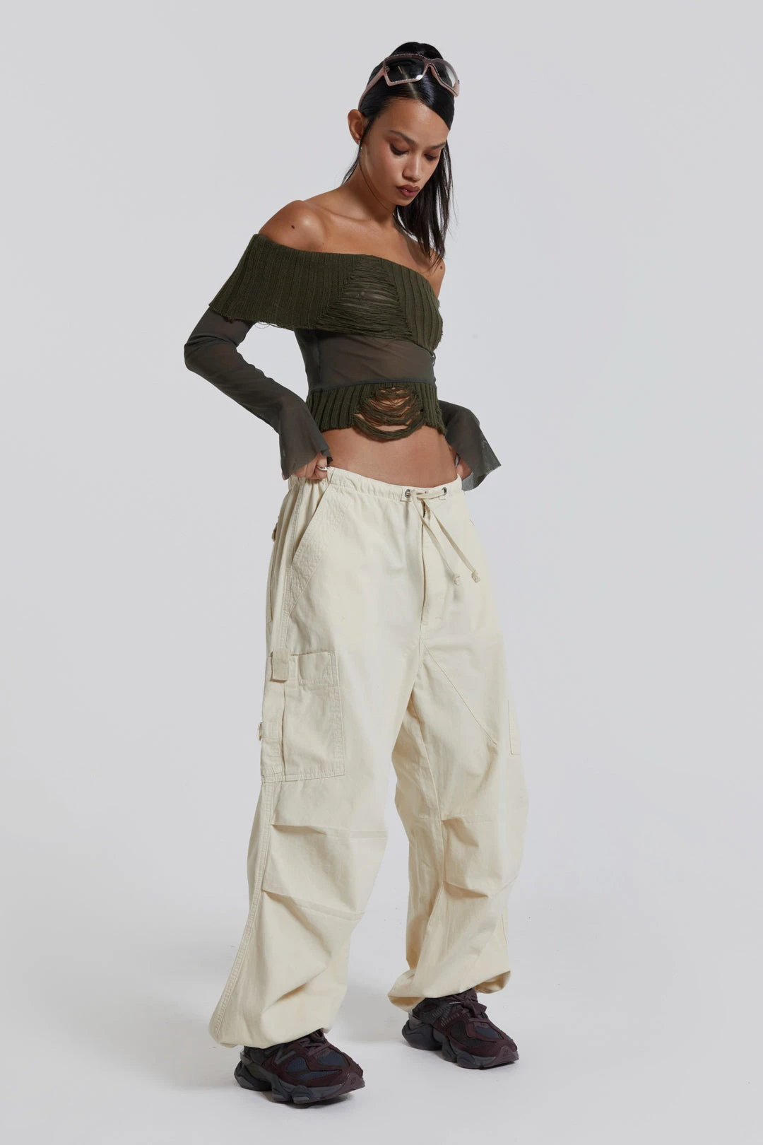 Designed with an oversized fit and a combination of metal eyelets, zip fly and adjustable cotton drawcord, our Ecru Parachute Cargo Pants deliver refined luxury and ultimate comfort. Details such as a pleated knee and inside leg darts ensure a perfect fit, while a six-pocket styling and a unique airpod pocket provide functional convenience. Elevate any look with this timeless and classic silhouette.