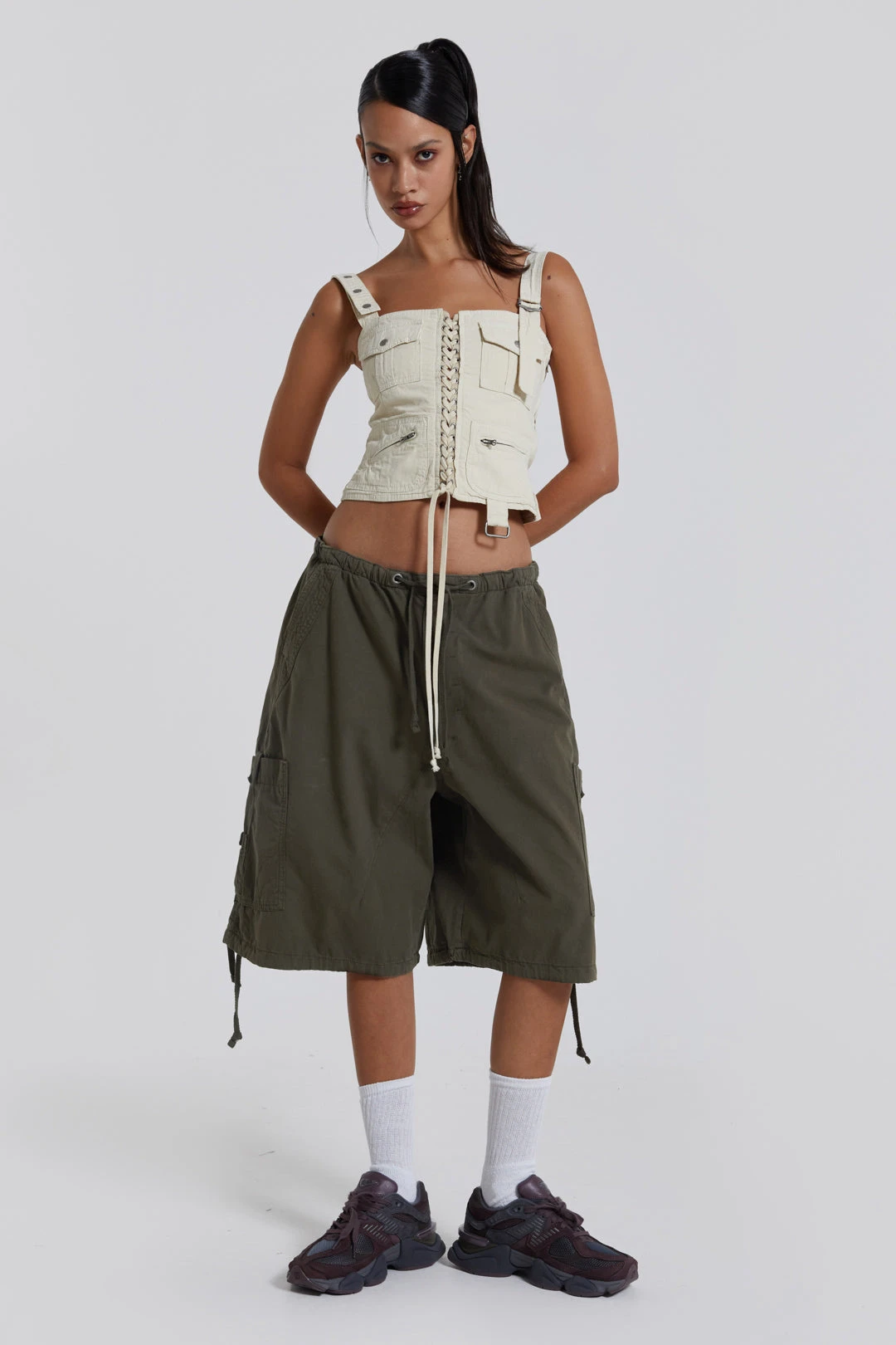 Discover the unparalleled comfort and style of the Khaki Parachute Cargo Shorts. These shorts feature an oversized fit and six-pocket styling, accompanied by an elasticated waistband and adjustable cotton drawcord for added flexibility.