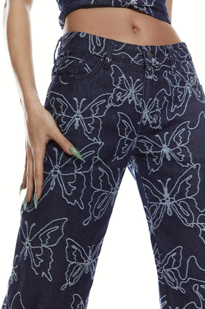 Petite Blue Embossed Butterfly Denim Low Rise Boyfriend Fit Denim Jeans