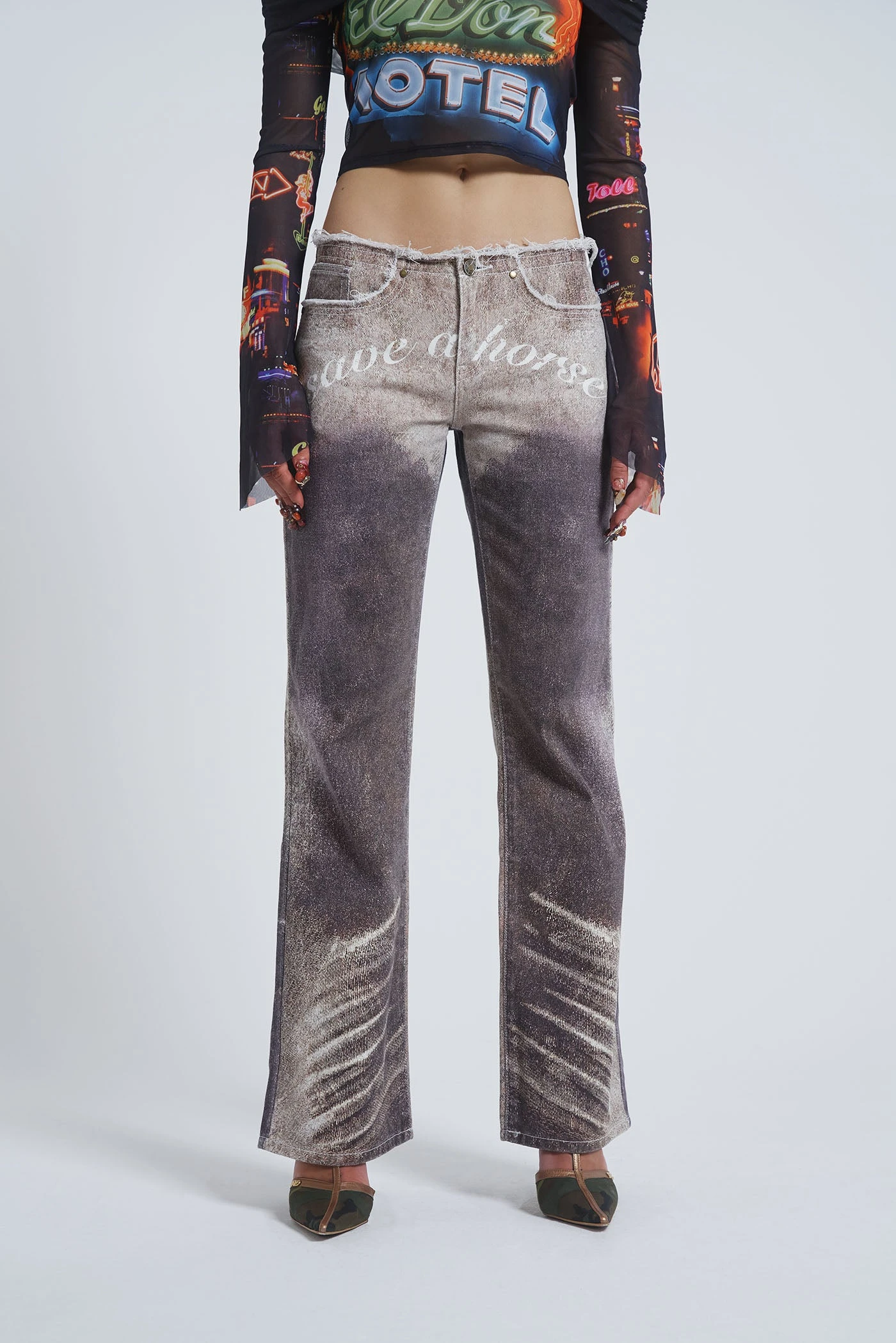 Our Ride a Cowboy Jeans are crafted in a 00’s denim wash in a low rise, straight leg fit. The jeans feature a frayed waistband and pocket edges with a horseshoe back patch and finished with a œSave a horse, ride a cowboy slogan placement print.