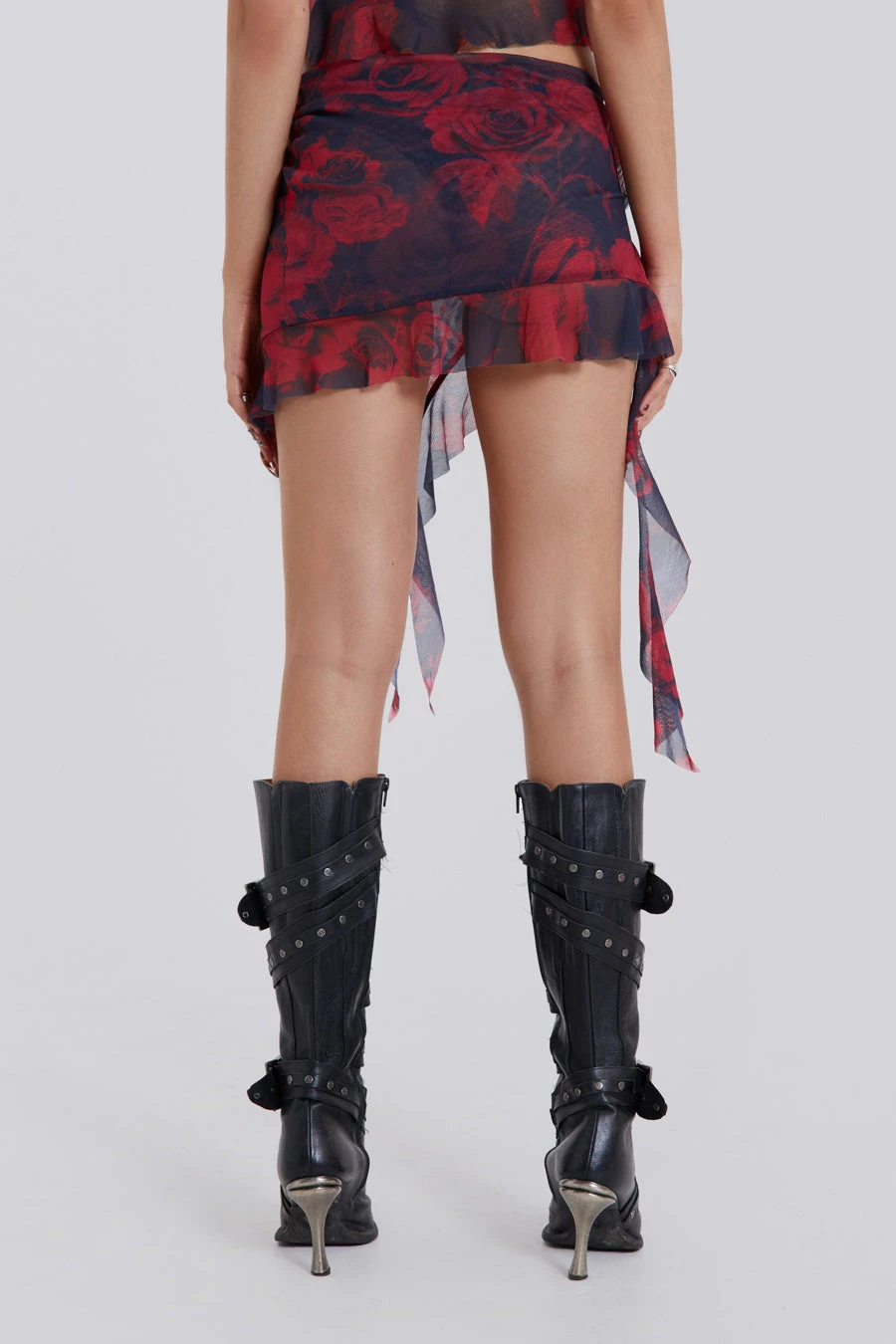 Crafted from chiffon, our Selene Asymmetric Skirt boasts a dark rose print in a mini length with a frill hem detail. Part of a co-ord, this skirt can be paired with the matching top and neck tie.
