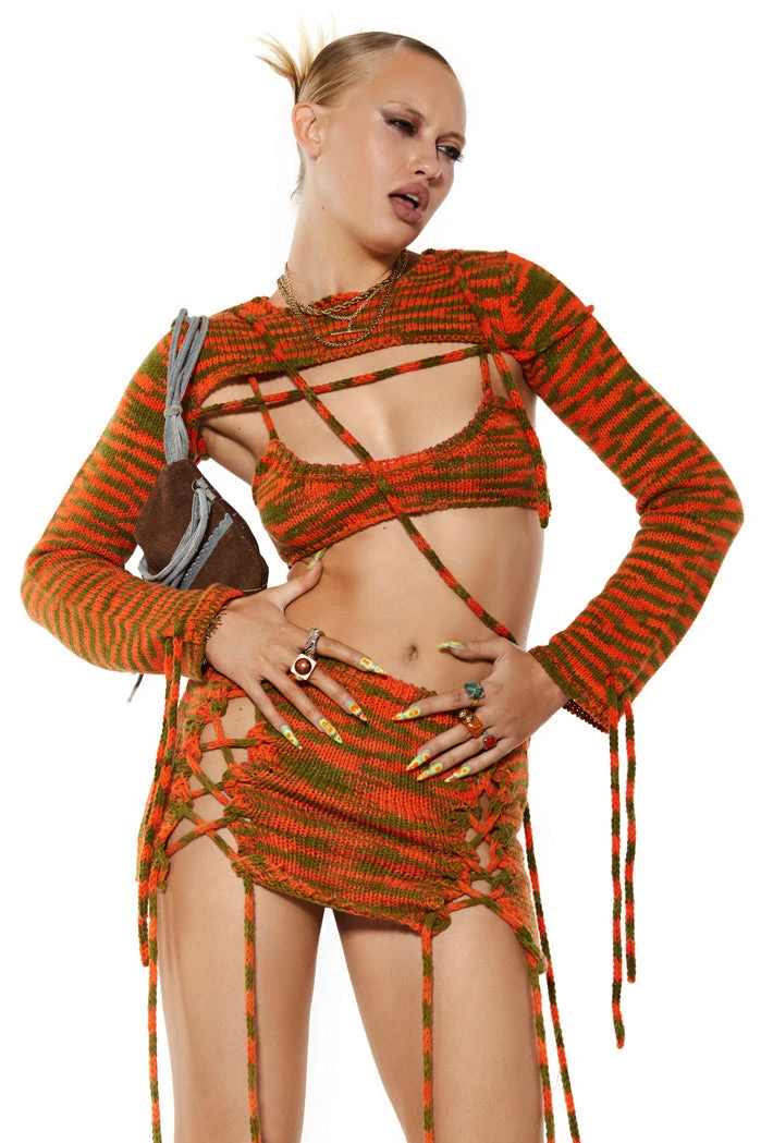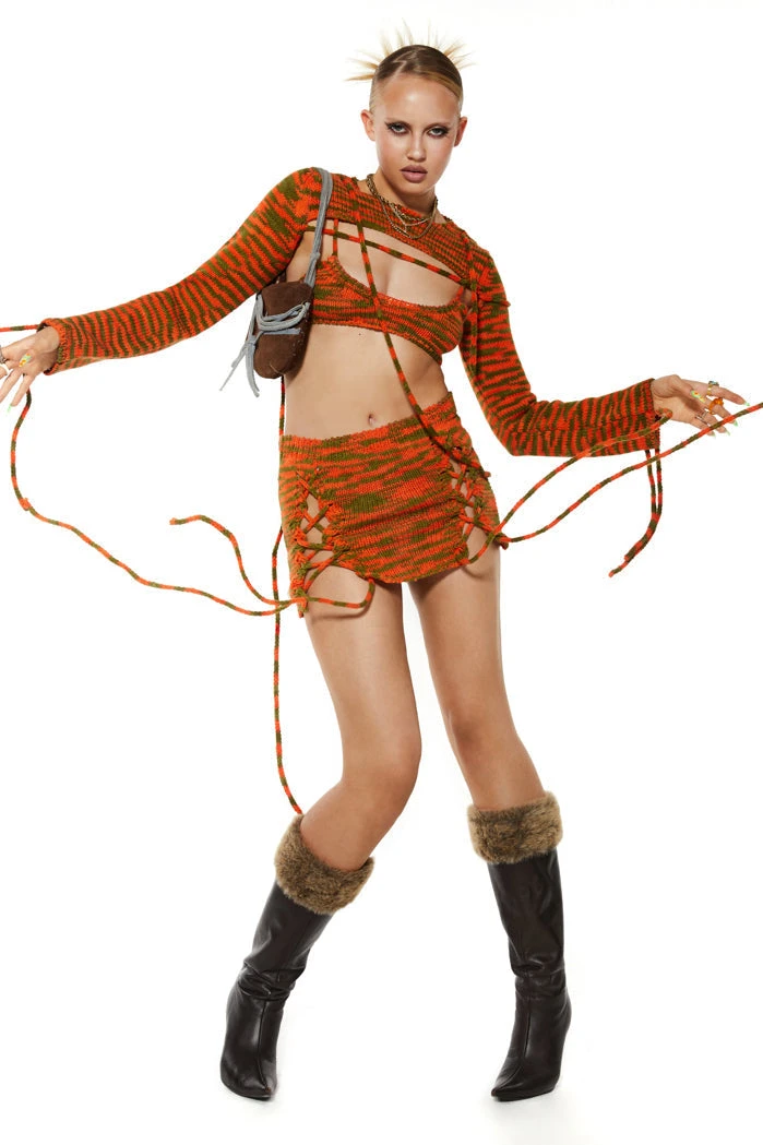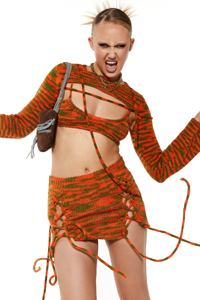 Chunky Green & Orange Knit Lace Up Detail Mini Skirt