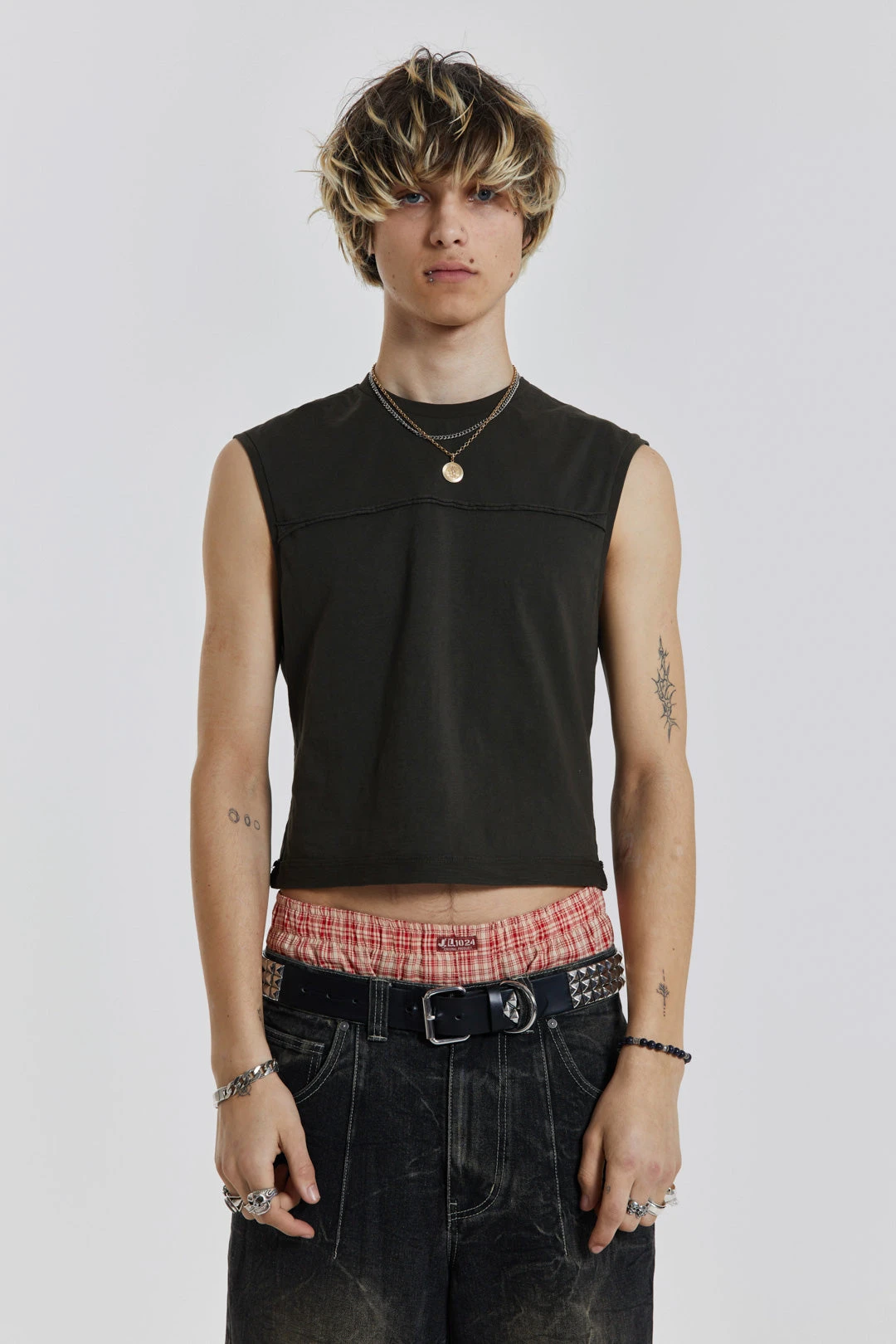 Introducing the Khaki Slub Tank. Crafted from a lightweight khaki slub jersey, with rib sleeve and neck finish with an exposed raw yoke seam.