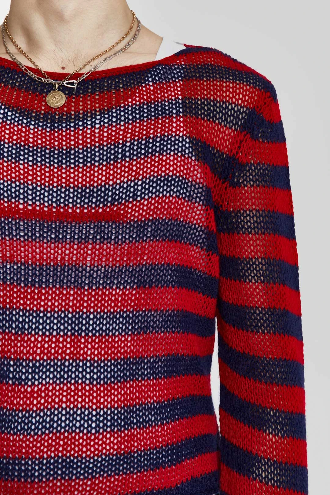 Introducing the Menace Knit, featuring a regal red and navy stripe, this piece is crafted from a slightly brushed yarn. Finished with a slash neck, cast off finish, roll hem and sleeve with a slight flare.