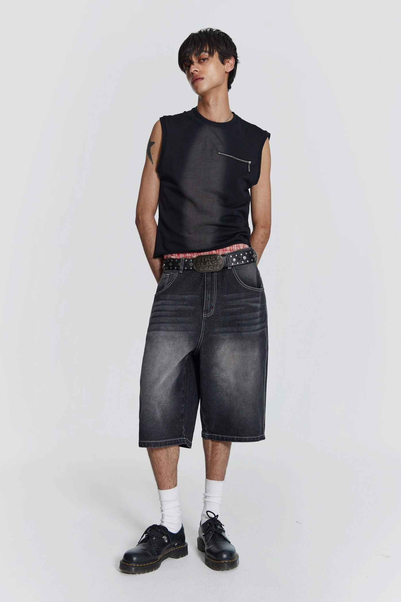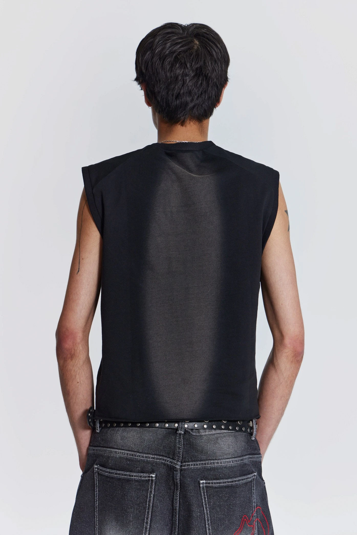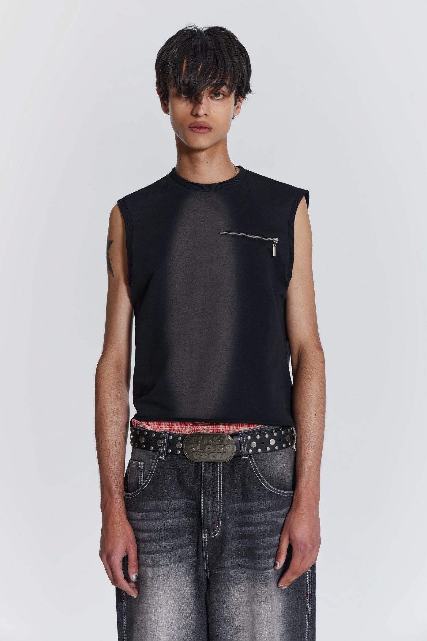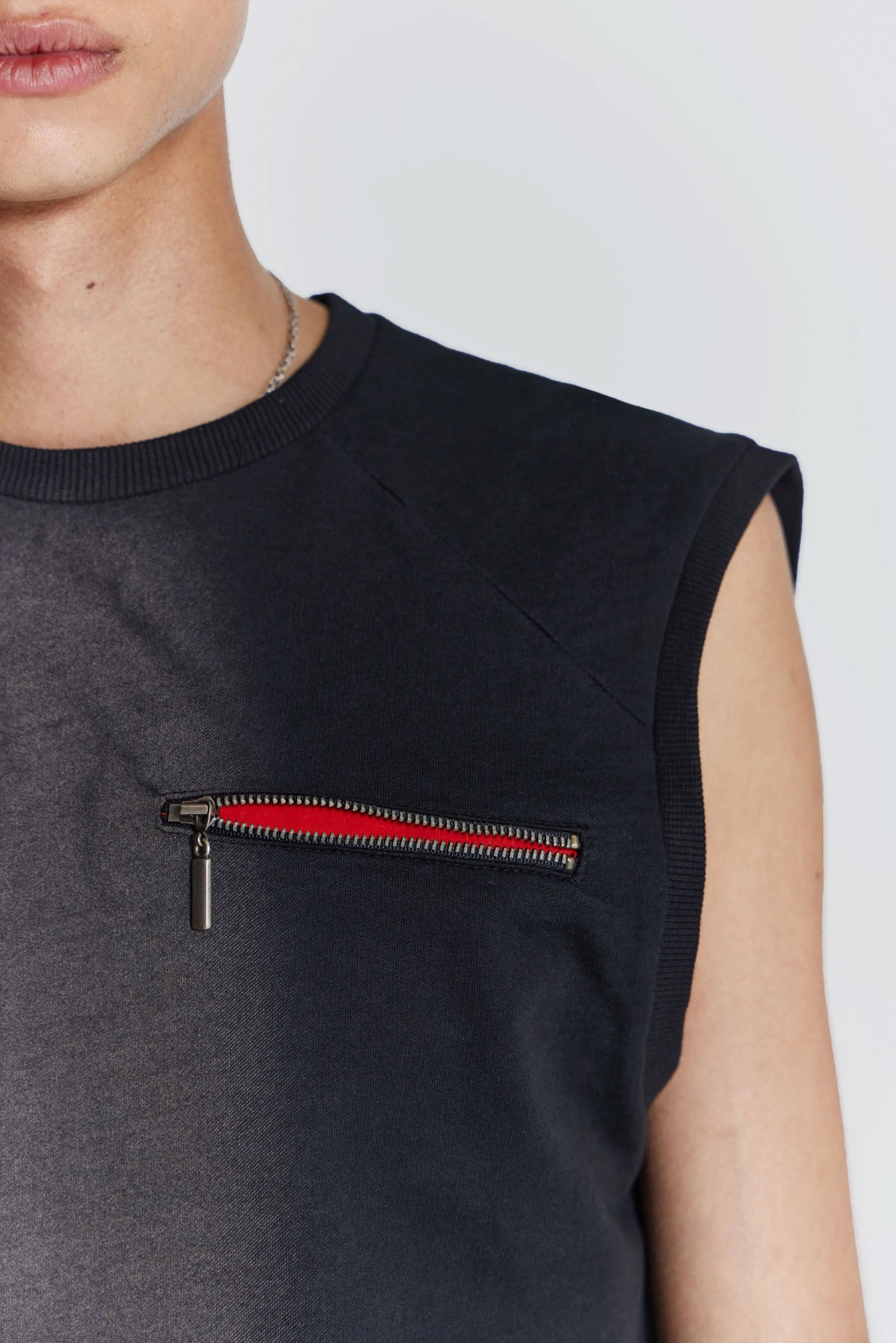 Introducing the Shade Loopback Tank, crafted from a loopback sweat fabric in a washed black colourway, with a placement acid wash. The tank is detailed with a zip mock pocket with red lining, raglan seam detail and ribbed neck and armhole.